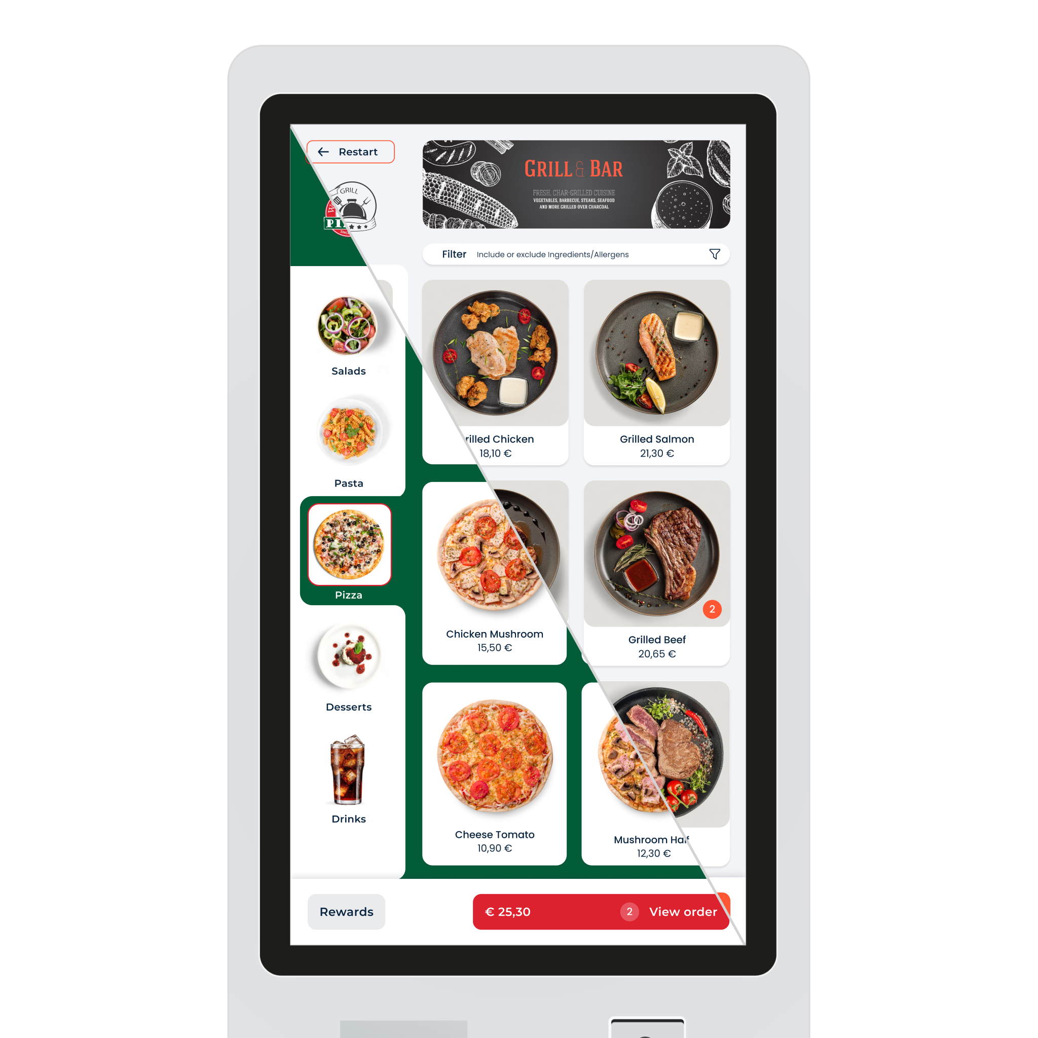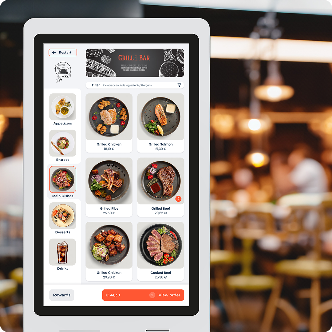 Rehaussez l'identité de votre restaurant avec des kiosques entièrement personnalisables qui s'harmonisent parfaitement avec votre marque. Des couleurs de votre signature et de votre logo aux arrière-plans et polices de caractères personnalisés, chaque point de contact renforce votre style unique et crée une expérience gastronomique cohérente